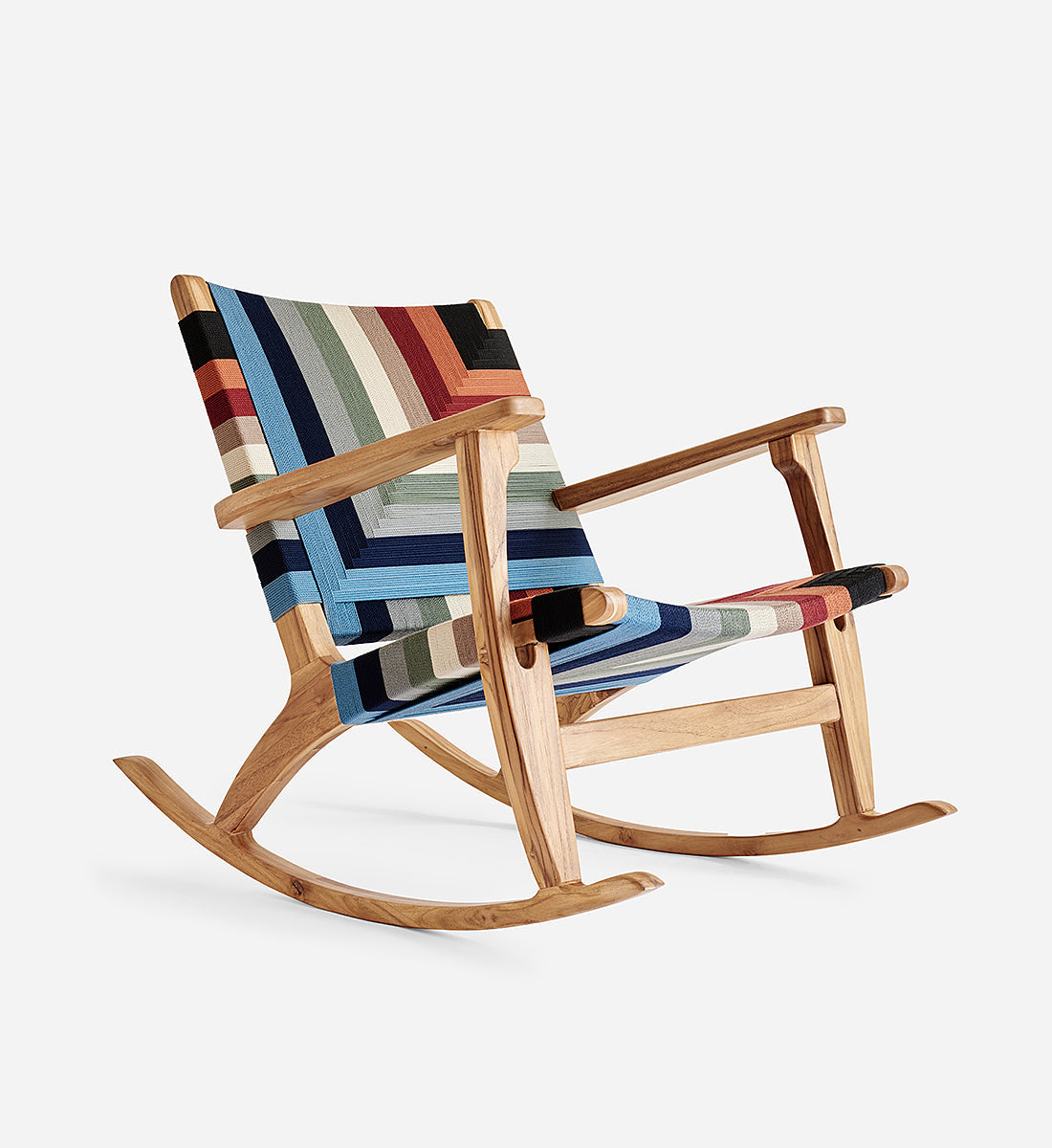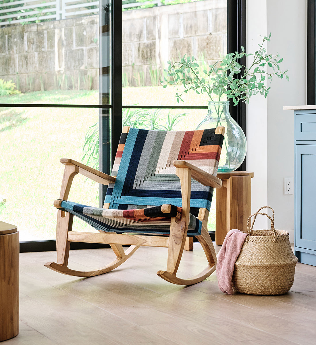 Small but striking, the Casares Lounge Chair is crafted from 100% FSC®-Certified teak wood with a colorful woven cord seat and backrest. An eco-friendly accent for compact spaces.